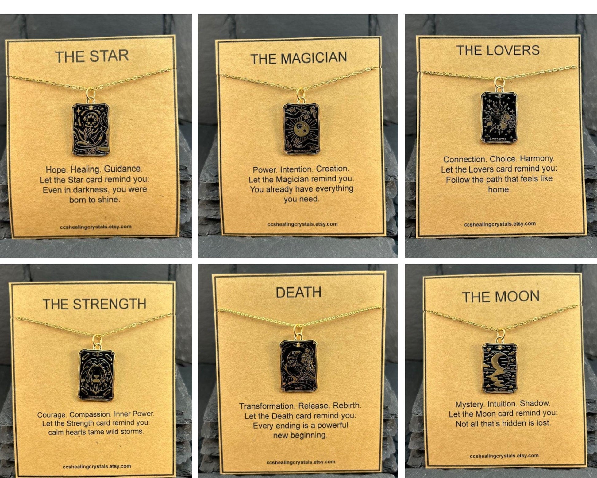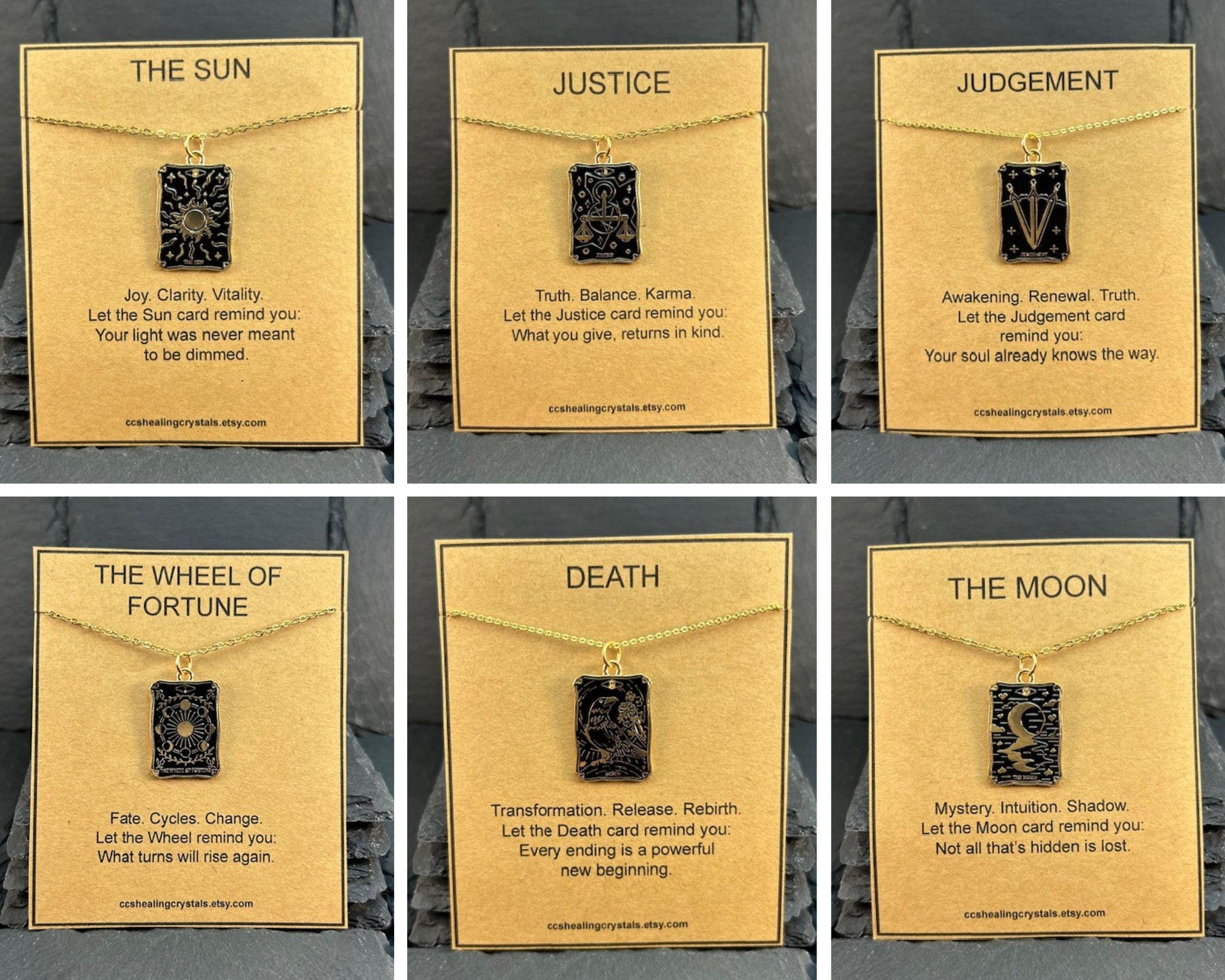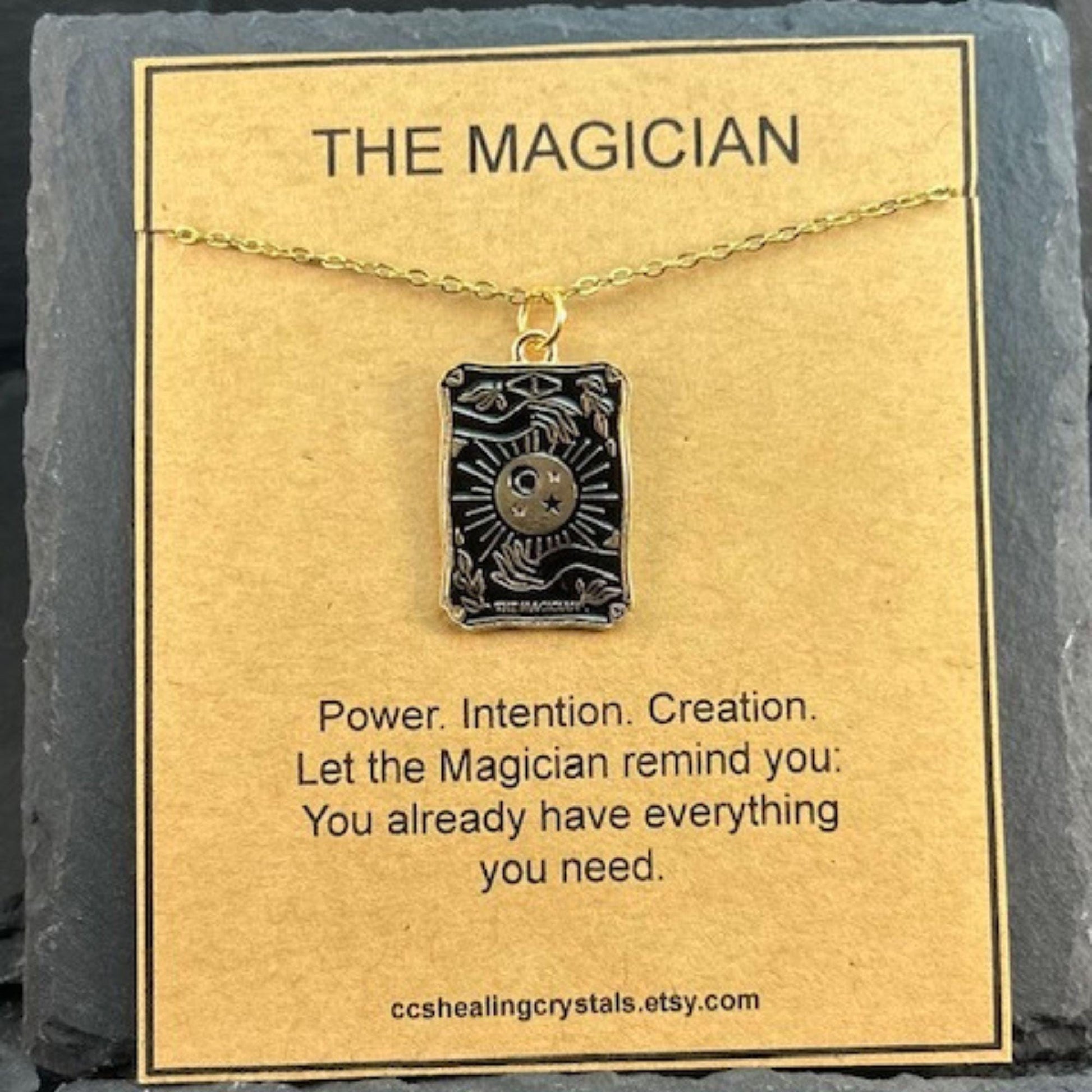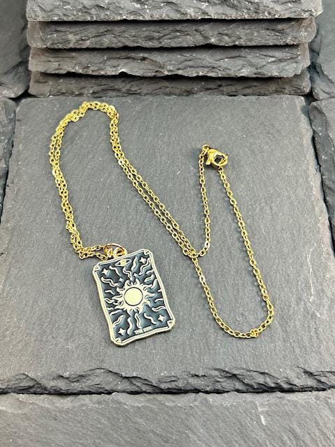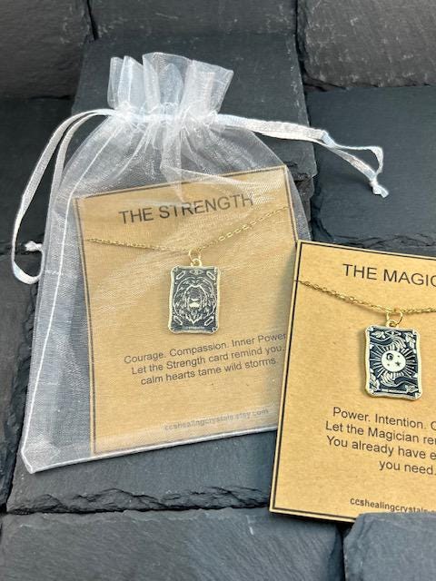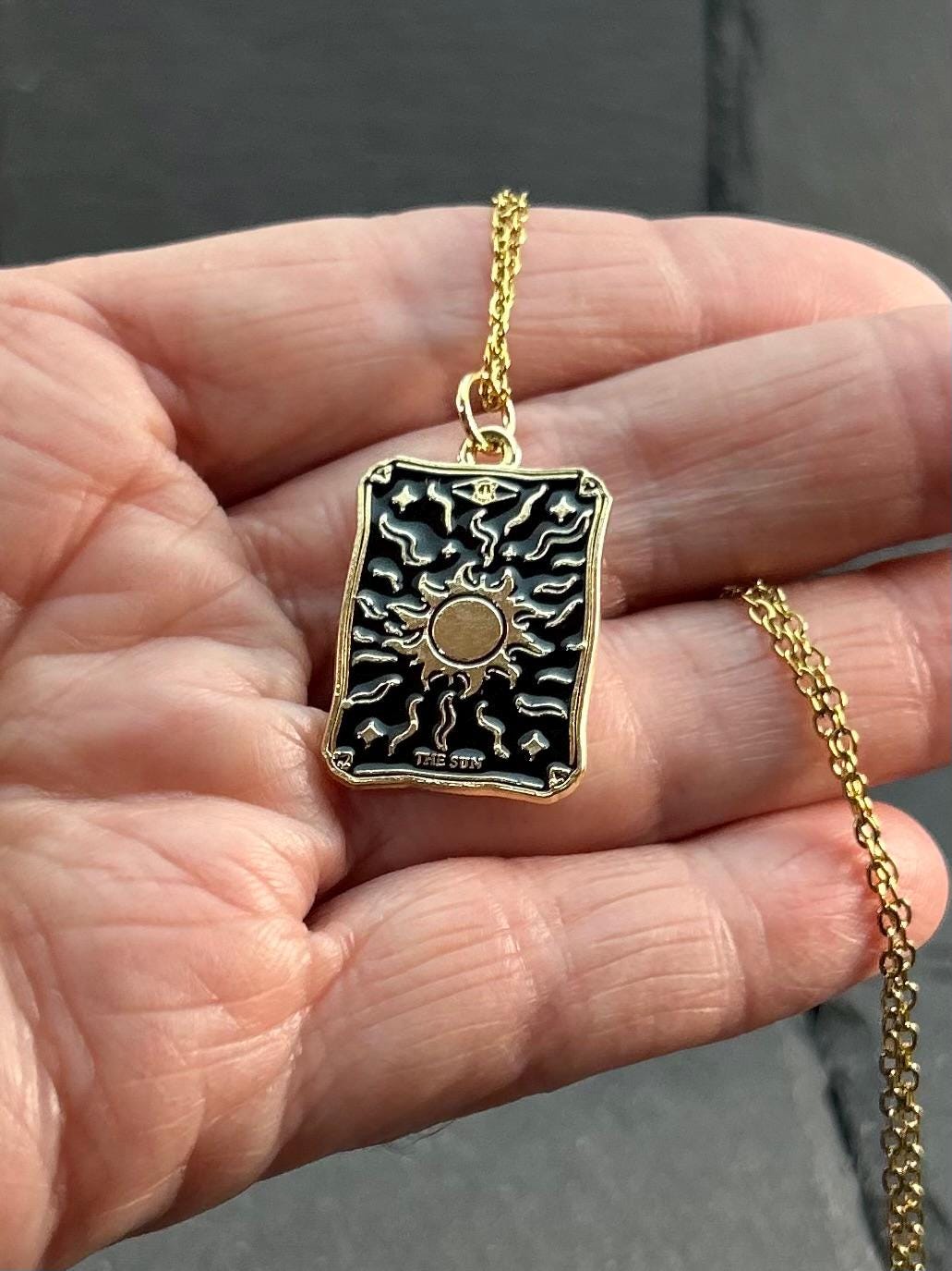 Tarot Card Necklace with Gift Card – 18" Stainless Steel Chain – Alloy Pendant – Organza Gift Bag Included Embrace the wisdom of the tarot with this meaningful and stylish tarot card necklace. Featuring a detailed alloy pendant on an 18" stainless steel chain, each necklace comes with a beautifully designed message card tailored to the tarot card you choose – such as The Lovers or The Sun – along with an elegant organza gift bag for effortless gifting. Whether you're drawn to the symbolism of connection, joy, or clarity, this tarot charm makes a thoughtful gift for yourself or a loved one on a spiritual journey. ✨ Details: • Alloy tarot card pendant – gold-plated with black enamel detailing • 18" durable stainless steel chain • Includes a printed tarot meaning card (see photos) • Comes in an organza gift bag – ready for gifting • Lightweight and easy to wear daily • Choose from The Lovers or The Sun 🎁 Perfect for: • Spiritual jewelry lovers • Tarot readers & astrology fans • Friendship, love, or self-empowerment gifts • Birthdays, holidays, or "just because" moments Wear your card, trust your path, and let the message guide you.